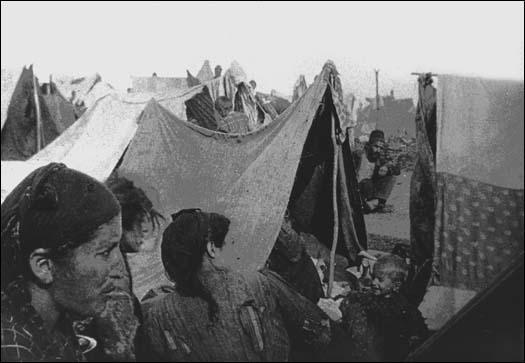 Scattered deportees in a desert wasteland, individually foraging as their only source of food. There is no shelter, water, or habitation in sight.